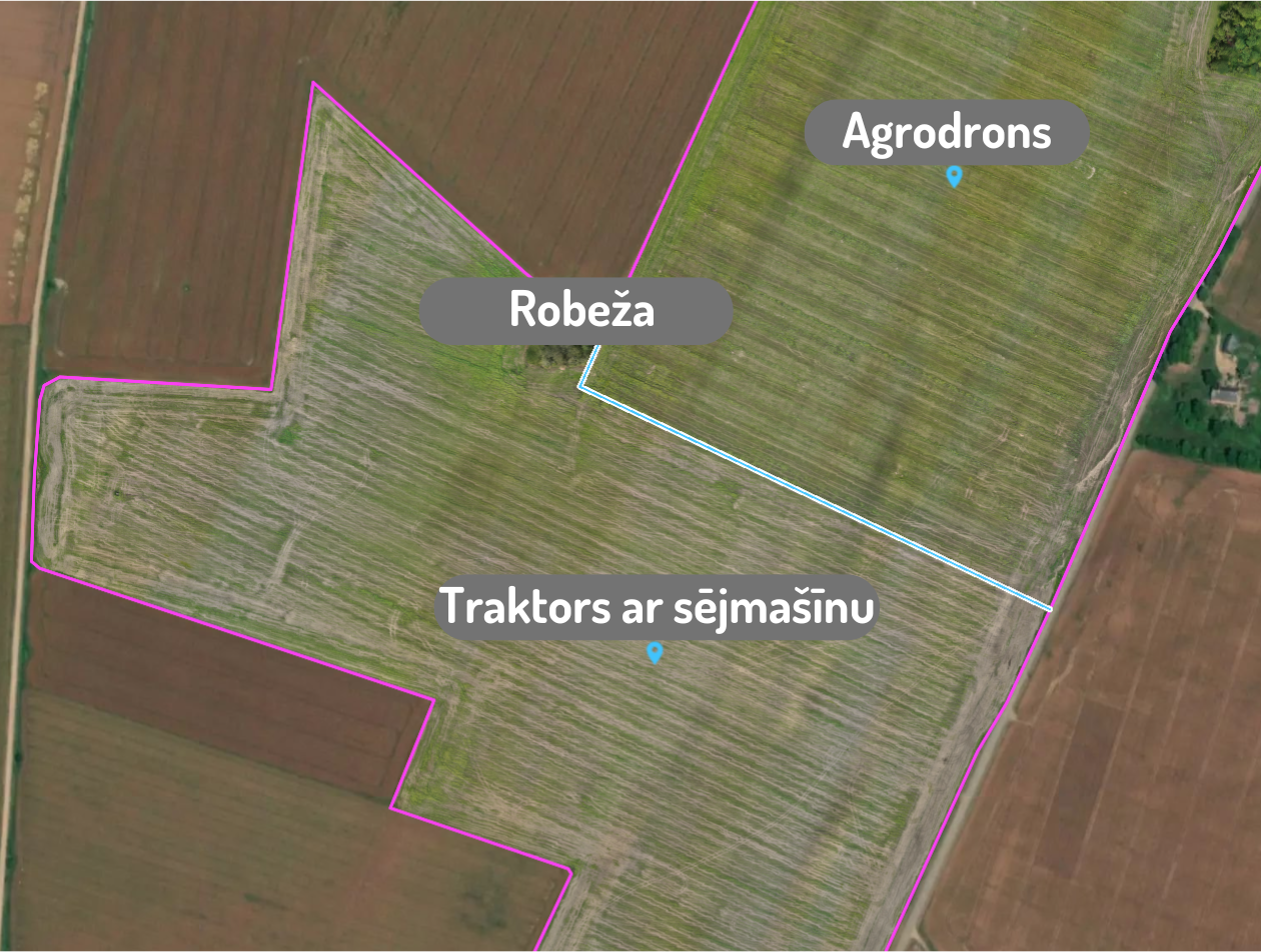 Viena lauka daļa tika apstrādāta ar agrodronu, bet otra ar traktoru un sējmašīnu.