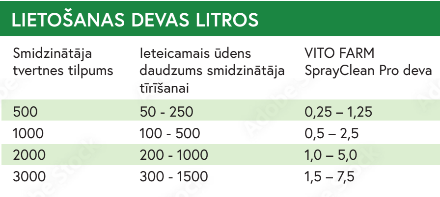 VITO FARM SprayClean Pro ir speciāli formulēts šķīdums smidzinātāju tīrīšanai, kurš noārda augu aizsardzības līdzekļu atliekas un nosēdumus, tai skaitā eļļainas vielas no tvertnes, šļūtenēm, filtriem un sprauslām. VITO FARM SprayClean Pro palīdz iztīrīt smidzinātāju no grūti šķīstošām nogulsnēm pēc mikrodevu herbicīdu lietošanas. Ieteicams arī papildus atsevišķi tīrīt maisītāju, sietus, filtrus un sprauslas, lietojot mazgāšanas šķidrumu.